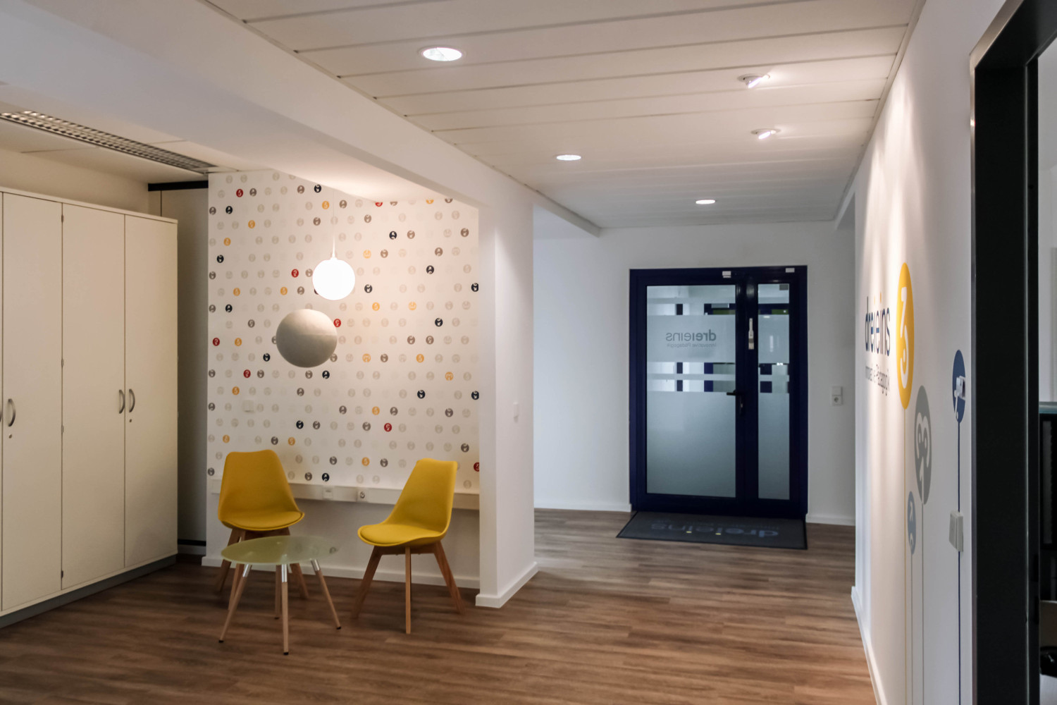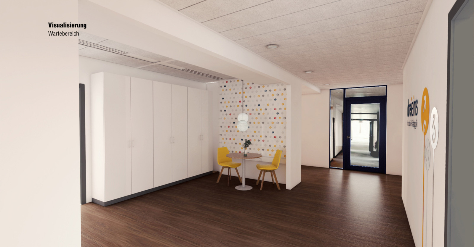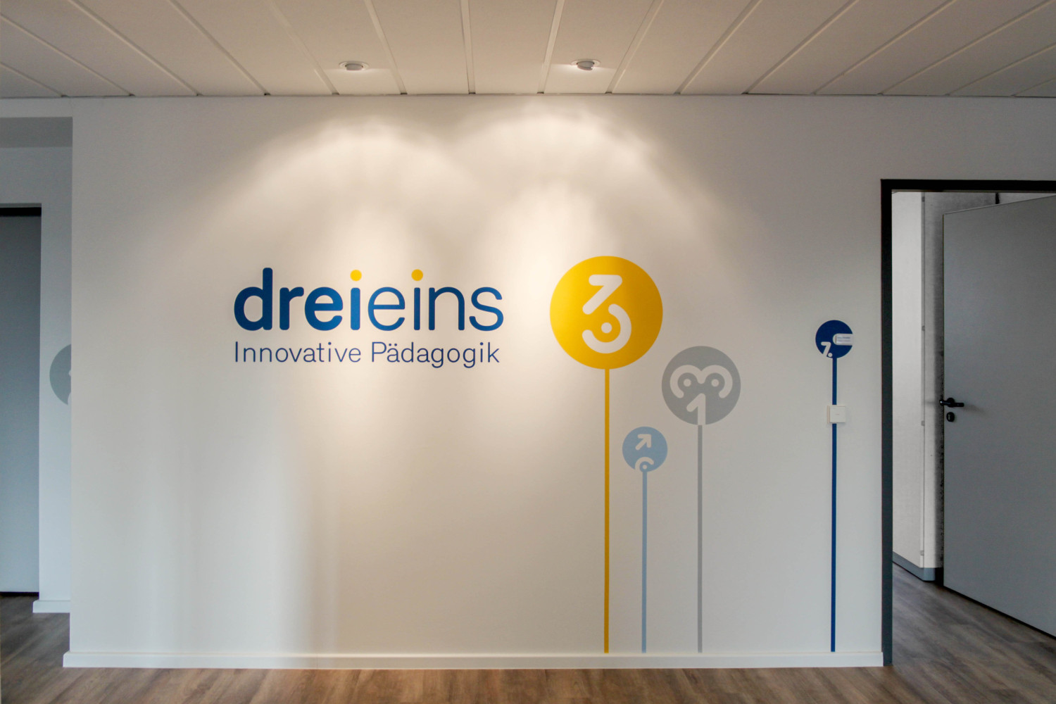 Das gestalterische Konzept greift prägende Elemente aus dem grafischen CI-Konzept auf, so sind die eingebrachten Möbel und Formen eher rund, wie auch die charakteristischen Kreise des Logos. Diese Kreise finden sich im Rapport gesetzt an einigen Stellen als Tapete wieder. Übergroß in Form von Folienplots auf die Wände projiziert dienen sie als spielerische Wandgestaltung, der Bezug zum kindlichen Bildungsangebot der Firma wird hergestellt ohne übertrieben zu werden. Auch die eingebrachten Farbakzente orientieren sich an den CI-Farben Gelb, Dunkelblau, Hellblau und rot, ergänzt und zur Ruhe gebracht werden diese durch Holzkomponenten und graue Elemente.