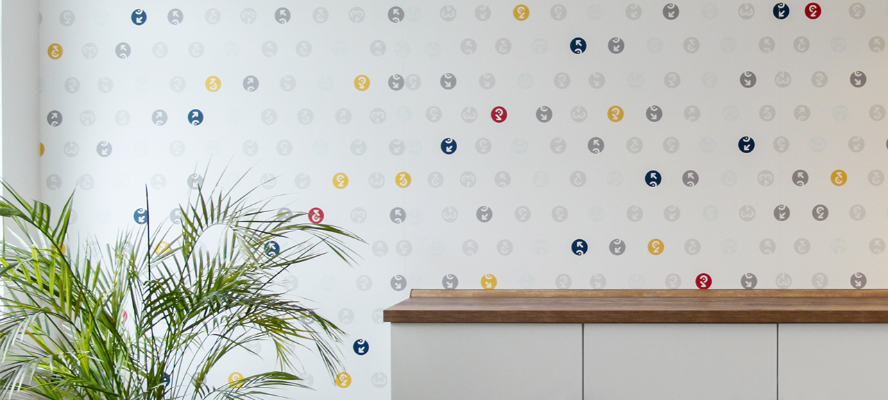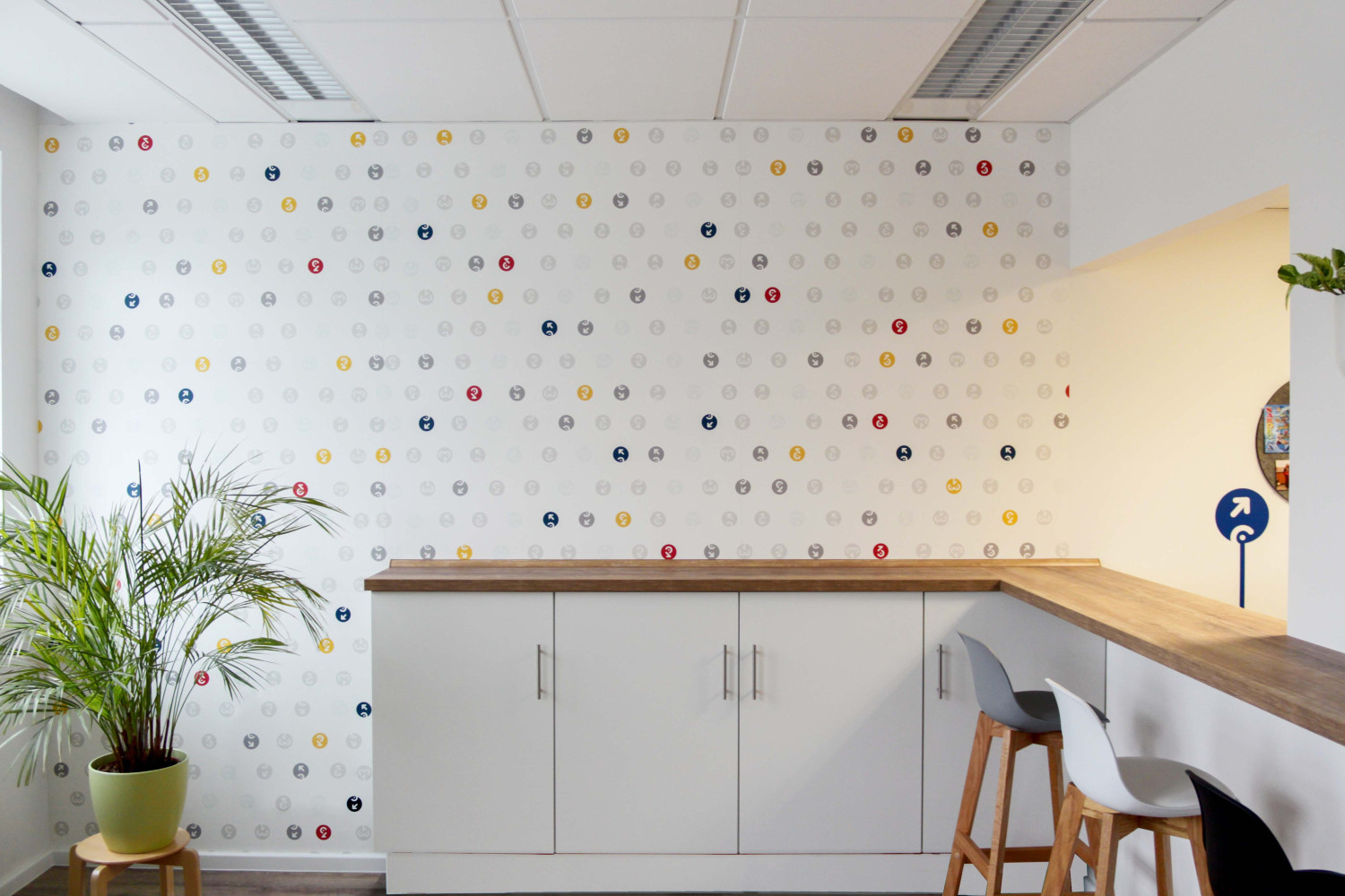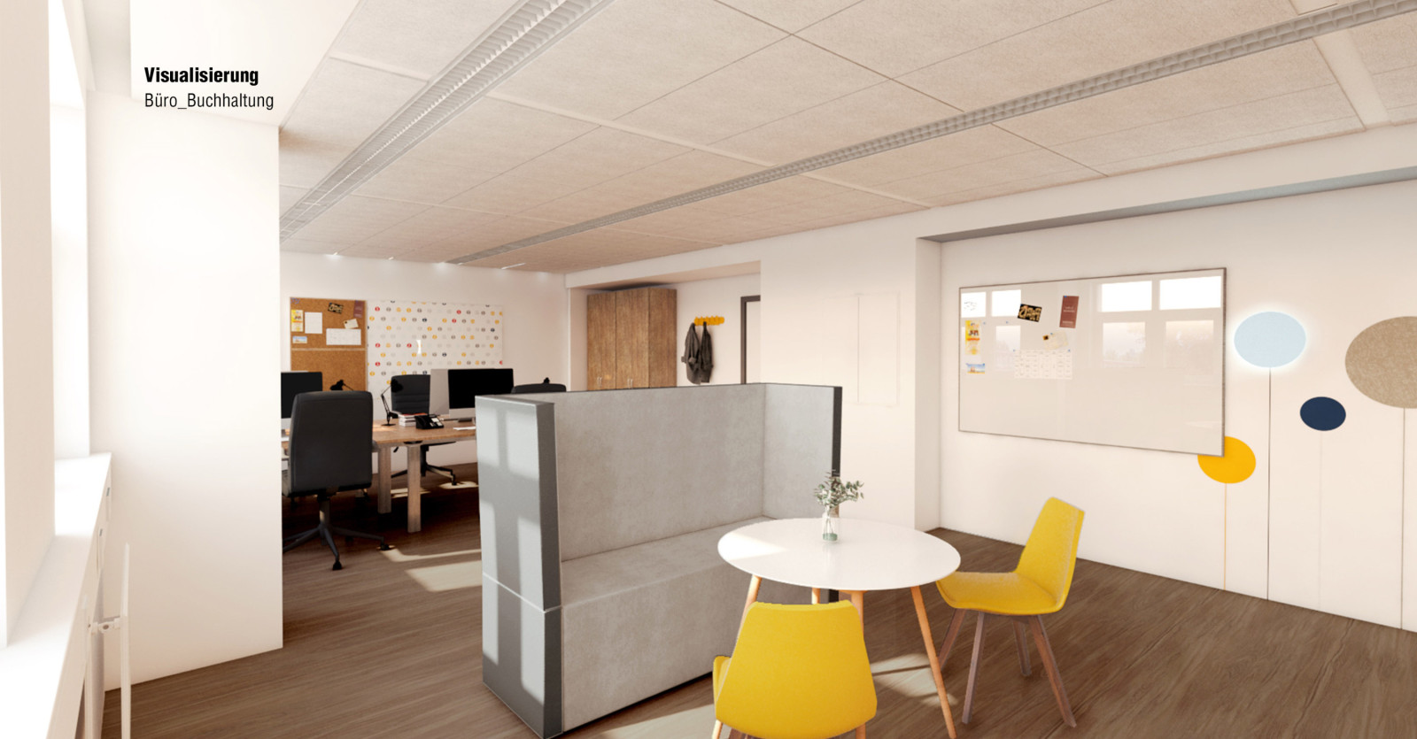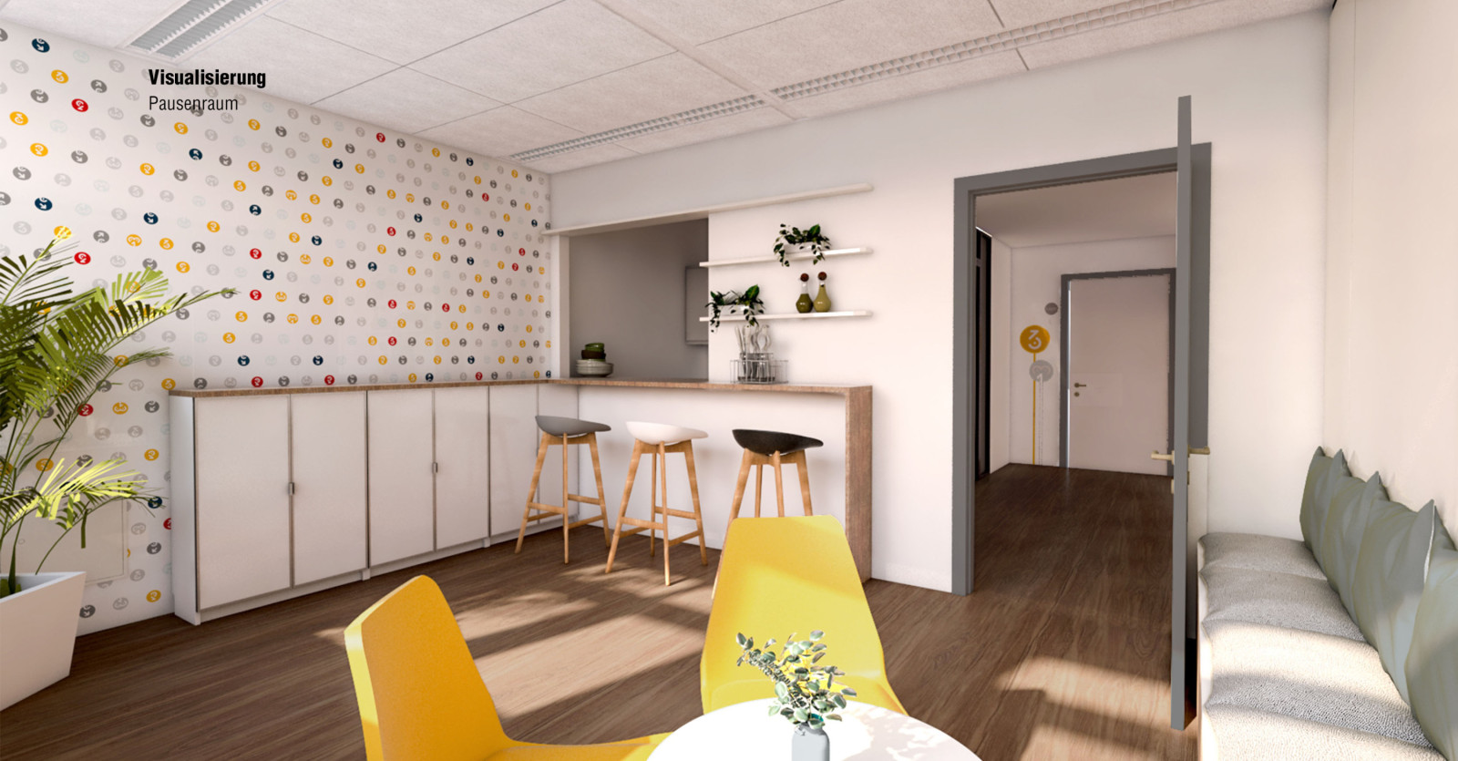 Das gestalterische Konzept greift prägende Elemente aus dem grafischen CI-Konzept auf, so sind die eingebrachten Möbel und Formen eher rund, wie auch die charakteristischen Kreise des Logos. Diese Kreise finden sich im Rapport gesetzt an einigen Stellen als Tapete wieder. Übergroß in Form von Folienplots auf die Wände projiziert dienen sie als spielerische Wandgestaltung, der Bezug zum kindlichen Bildungsangebot der Firma wird hergestellt ohne übertrieben zu werden. Auch die eingebrachten Farbakzente orientieren sich an den CI-Farben Gelb, Dunkelblau, Hellblau und rot, ergänzt und zur Ruhe gebracht werden diese durch Holzkomponenten und graue Elemente.