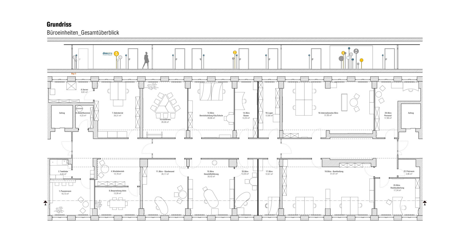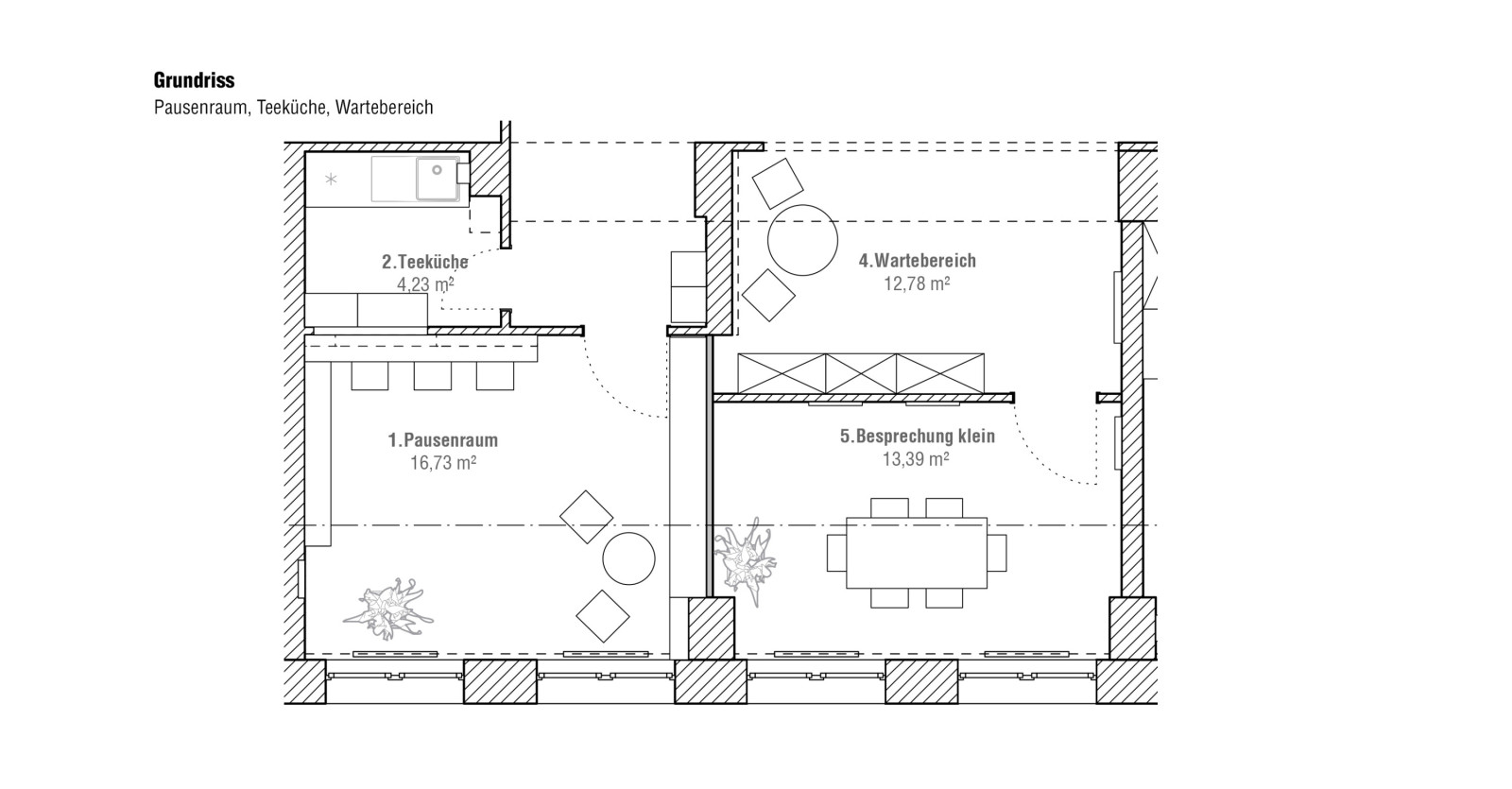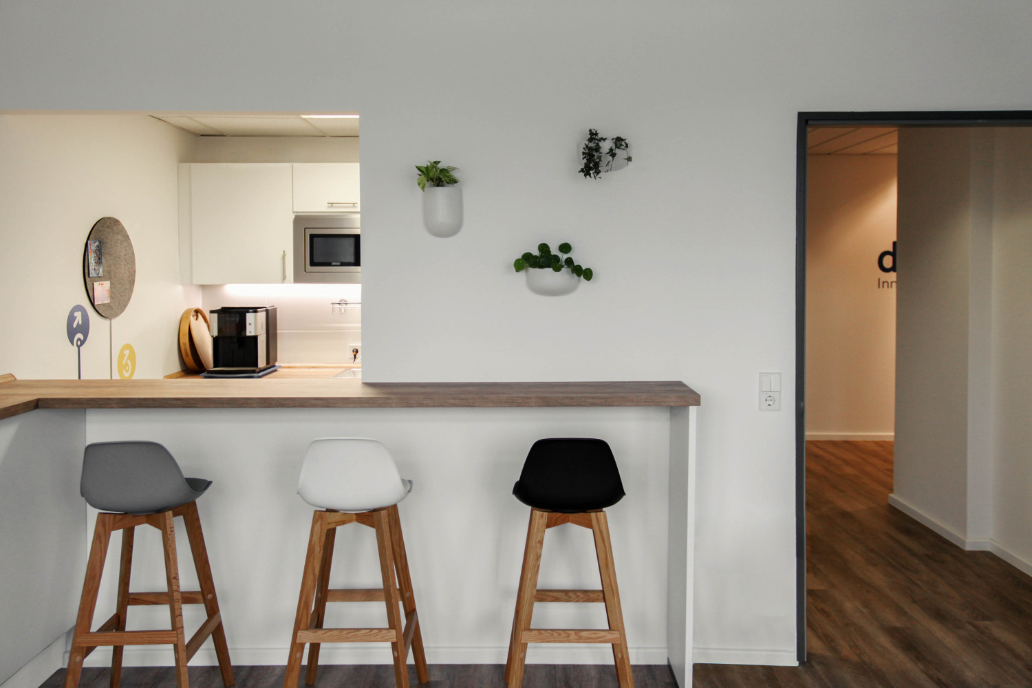 Die neuen Verwaltungsräume für einen privaten Bildungsträger in Berlin galt es zu gestalten und konform mit der Arbeitsstättenrichtlinie zu möblieren. Neben kleineren baulichen Eingriffen, wie dem Teilen von zwei großen Büros in vier kleine, war uns strukturell besonders wichtig die nur vier Quadratmeter große Teeküche ohne Fenster von Ihrem Außenseiterdasein zu befreien und in Einklang mit dem angrenzenden Pausenraum zu bringen. Aus baulichen und platzbedingten Gründen, war eine komplette Öffnung des Raumes nicht möglich, weswegen wir uns für einen großzügigen Durchbruch auf Tresenhöhe entschieden. Dadurch wurden beide Räume optisch miteinander verbunden und die Küche mit Tageslicht und einem Ausblick und Gefühl von Weite auf wenig Fläche versorgt.
